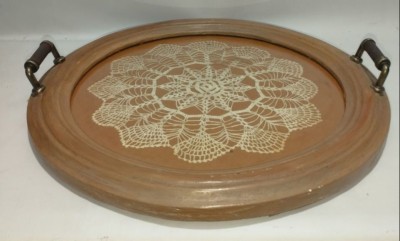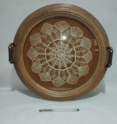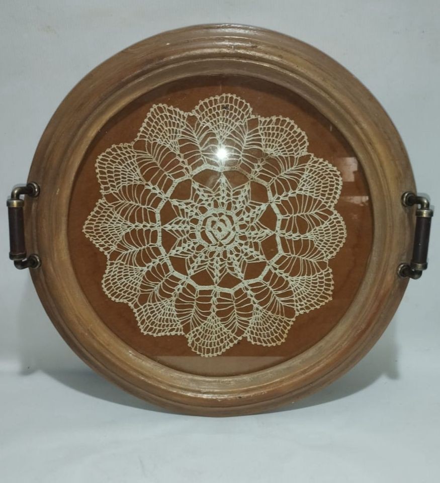bandeja em madeira e vidro com toalhinha em tricô 36 cm diâmetro